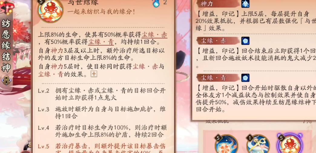 纺愿缘结神的一技能名为纺缘,强度平平无奇,满级有普攻可增加自身神力的效果,但是基本上不会让她打出普攻,所以可以直接无视掉。二技能为主动技能,在首次释放的时候会给友方目标添加胜之天缘效果,可以免疫推条。在第二次释放的时候则会解除胜之天缘,驱散全部减益和控制效果。该式神与被附加标记的队友等回合结束的时候会互拉条30%,意思就是她行动后直接拉行动条。
