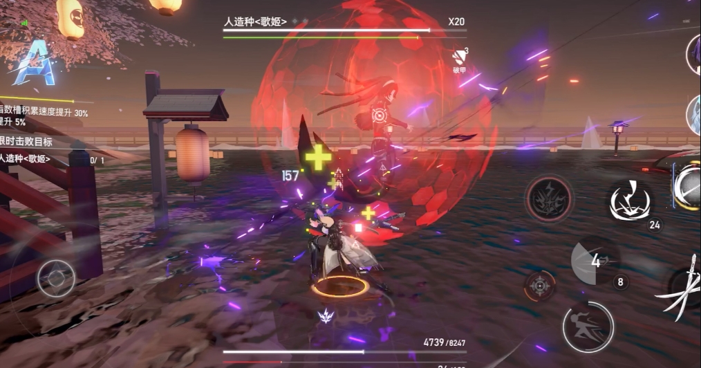招式三是歌姬会钻入地面并在远处跃出,跃出时会在十字型方位发射四个水泡,圆形范围提示为水泡的落点,这招是歌姬远离我方角色的位移手段,释放频率不是很高,应对上目押闪避地面预警就行。一阶段还会出现鲸鱼,鲸鱼身上会有高额减伤的护盾,所以第一阶段尽量优先攻击歌姬,鲸鱼招式一是它会钻入地面然后在远方出现并释放音波攻击,该招式在地面会有超大扇形范围提示,需要连续闪避才能跑出范围,这招偶尔会跟歌姬的音波形成夹击,注意不要闪错位置就行。招式二是鲸鱼会先潜入地面然后跃出翻身一圈落入地面,跃出和落地都会在地面生成圆形范围提示,如果跃出攻击锁定角色,鲸鱼会直接垂直落地,如果跃出攻击不锁定角色,落地攻击就会锁定,不过应对上也没什么难度,主要还是小心它跟歌姬混合攻击时带来的大量红色特效的干扰。