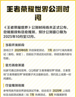 关于“王者荣耀世界上线时间”的最新进展,官方尚未发布具体日程安排。后续动态将持续跟进并及时同步。如需了解实时资讯,建议关注官方社交平台及游戏官网公告。