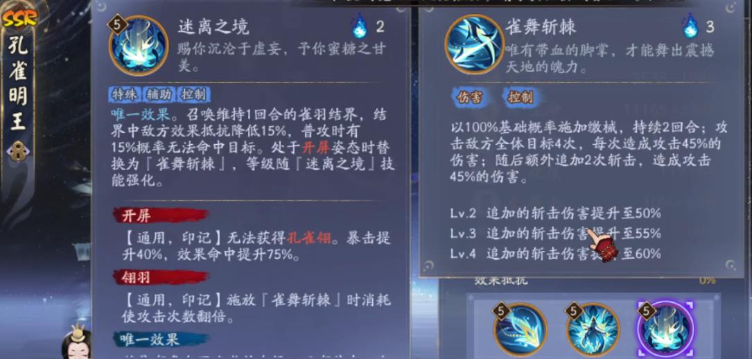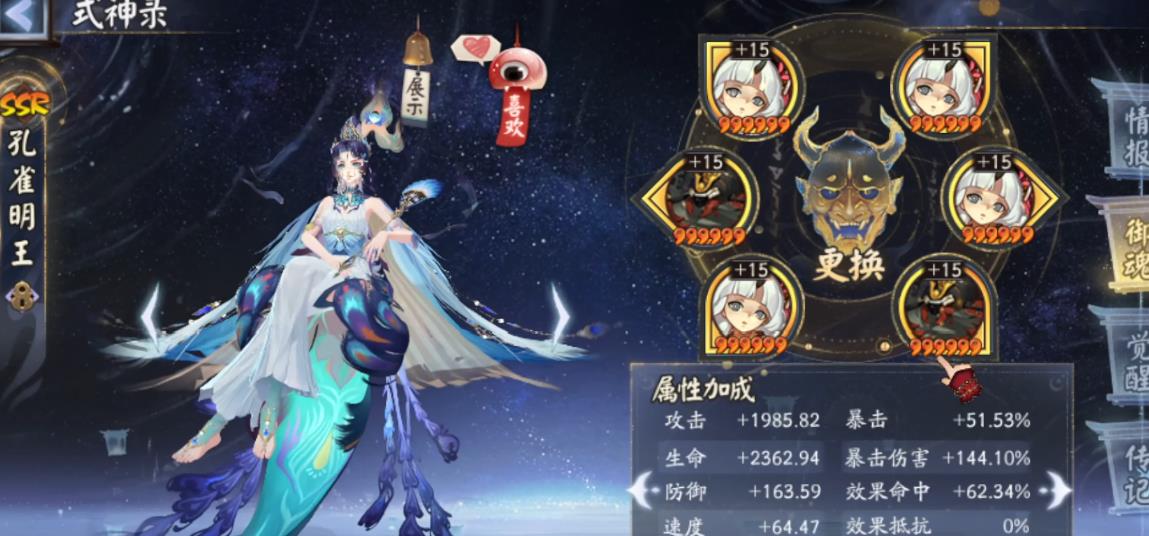 如果走控制路线,2、4、6号位就是宿命、攻击、防御等,四件套可选火灵、返魂香等辅助类御魂,主堆的为速度。在觉醒以后会加30%的命中属性,用完开屏技能也会加75%的命中,所以就算孔雀明王什么御魂都不带,开屏后也自带105%的攻击加成,也就是增加了3583乘以1.05等于3762左右的攻击伤害。