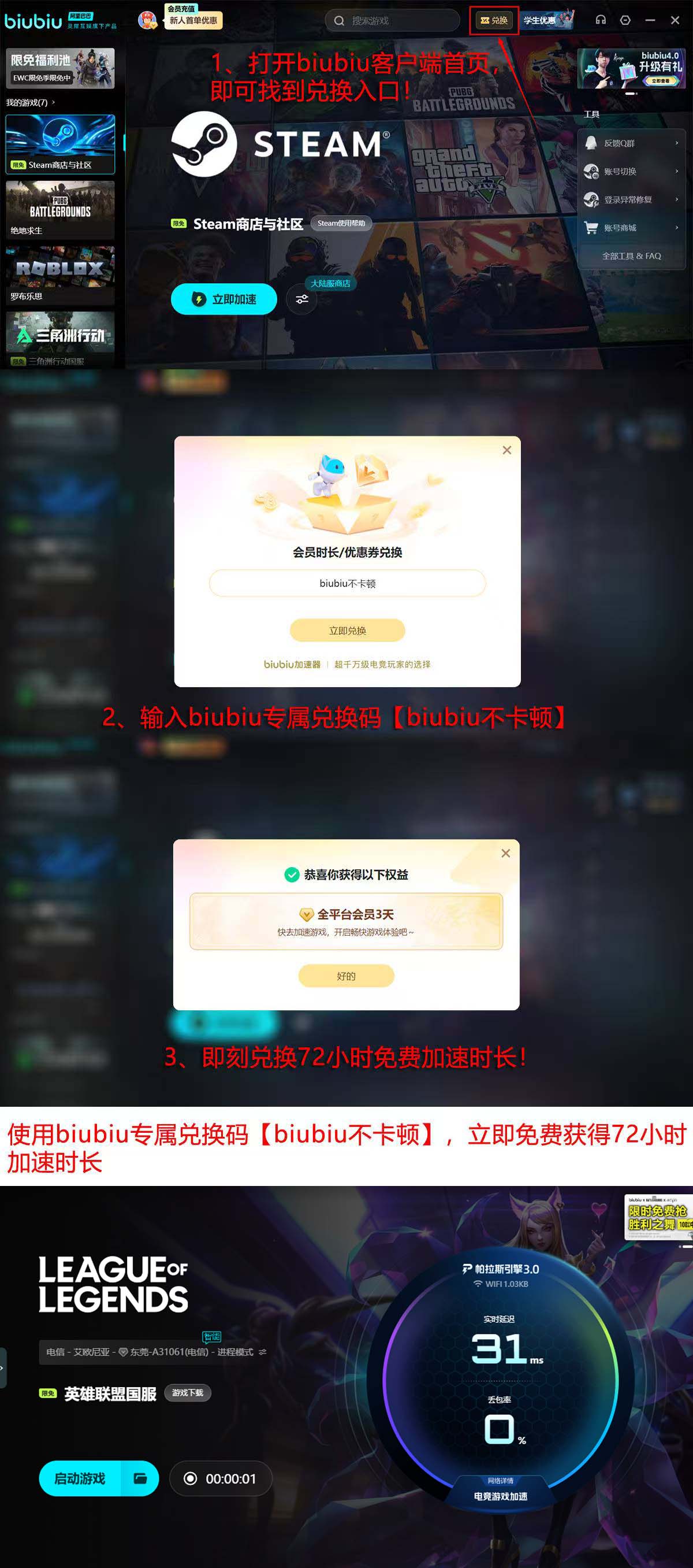 对于当前遭遇LOL卡在League界面的玩家,建议优先尝试网络优化方案。biubiu加速器支持免安装快速部署,从下载到首次启用全程耗时低于三分钟。新用户注册成功即可获赠24小时免费加速时长;随后前往客户端首页“兑换”入口,输入口令【biubiu不卡顿】,还可额外领取72小时使用权,总计可享96小时无限制体验。