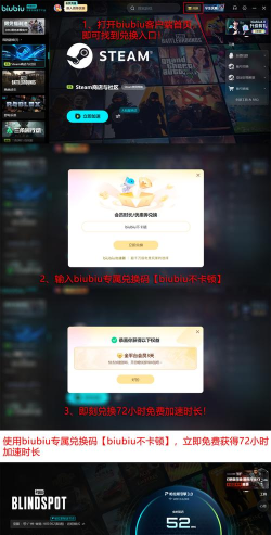 现在新用户可直接免费加速游戏,因为新号能获得24小时会员时间。还可以通过一个兑换码【biubiu不卡顿】兑换72小时会员时间,无论新老账号,兑换码都可用一次。新人一共能拿到96小时的试用时间。