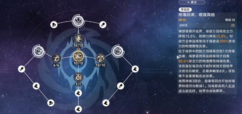 每回合能造成海瑟音百分之二十多的攻击,还有一种是裂伤,每回合能造成敌方生命值上限百分之二十的物伤,上限为海瑟音攻击的百分之二十五,两种持续时间都是两回合。这个机制对于海瑟音来说非常重要,因为海瑟音的终结技的结界附伤也需要通过这个天赋的频繁附加状态造成伤害来触发。海瑟音的终结技是通过展开结界来触发的,跟阮梅的结界相同,不过她的优势在于敌人转波次不会使她的效果马上就消失,结界拥有全体的减防和减攻效果。