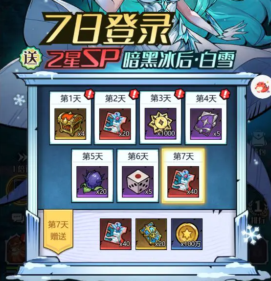 1、奖励亮点:累计登录7天,可获得SP暗黑冰后・白雪、30张抽奖券、100万金币、红色宝箱等丰厚奖励,是前期核心福利,务必每日登录领取。
