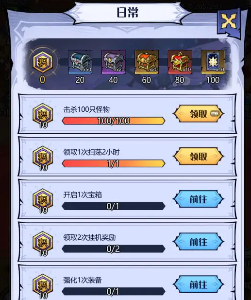 1、任务内容:击杀100只怪物、领取1次扫荡奖励、开启1次宝箱、领取2次挂机奖励、强化1次装备、招募1次英雄等(每日0点刷新)。