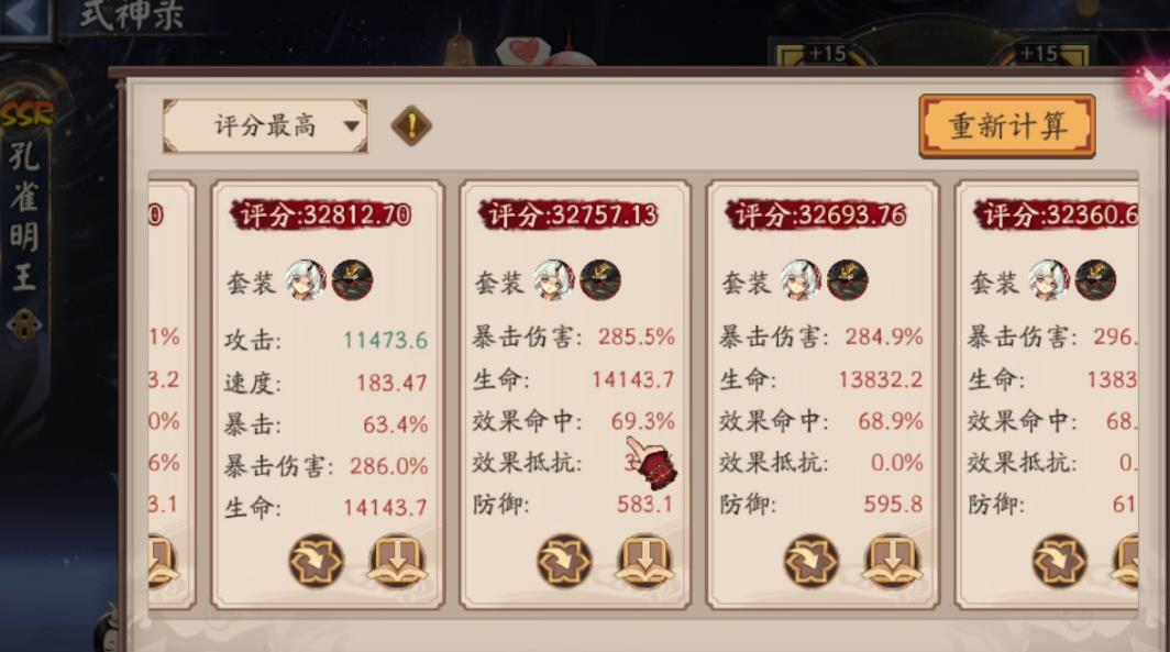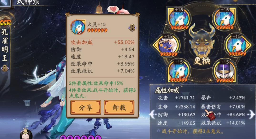 在实战过程中孔雀翎的获取情况为暖机两回合,输出三回合来循环。输出段数则取决于另外一个印记翎羽,作用是在孔雀输出时进行消耗,使攻击次数翻倍。在获得五层孔雀翎时会自动获得一层翎羽,并且提升式神50%速度。