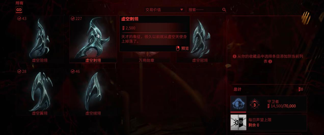 虚空之翎是一种可以在扎里曼号中获取的稀有物资,它有点类似于之前的集团勋章,不仅可以用来提高坚守者阵营的声望,还可以用来制作Gyre,风鸣,奏凯等该区域专属的战甲和武器。由于守望者是全新加入的集团,因此要想换完其中的物品,玩家就需要刷取大量的虚空之翎。