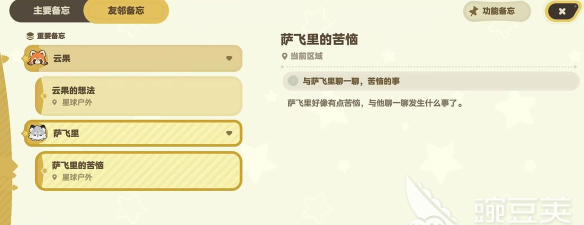 备忘录也是生活手账本,或者是任务本。在整个游戏当中会涉及到流星雨,日出,日落等等,玩家可以把观赏地点跟最佳的时间直接记录下来,然后就能够约自己的好友一起去体验或者是玩家在尝试新的料理配方的时候,直接把食材的搭配、烹饪步骤等等详细记录,在这样的情况下,玩家也能够更好的去体验游戏。当然自己还能够跟好友一起约定,比如说去钓鱼,或者是搭建小屋,在这样的情况下能够写进备忘录设置简易提醒。当然对于玩家来说,备忘录还会是玩家的创想灵感记录的本子,其实在整个游戏当中,玩家往往会冒出一些小灵感,剧情故事的设定等等,通常直接将这些记录下来,也能够变成一个具备创意的作品。