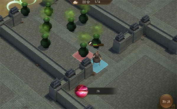第一回合我方走到图中位置用普通技能推上方罐子。