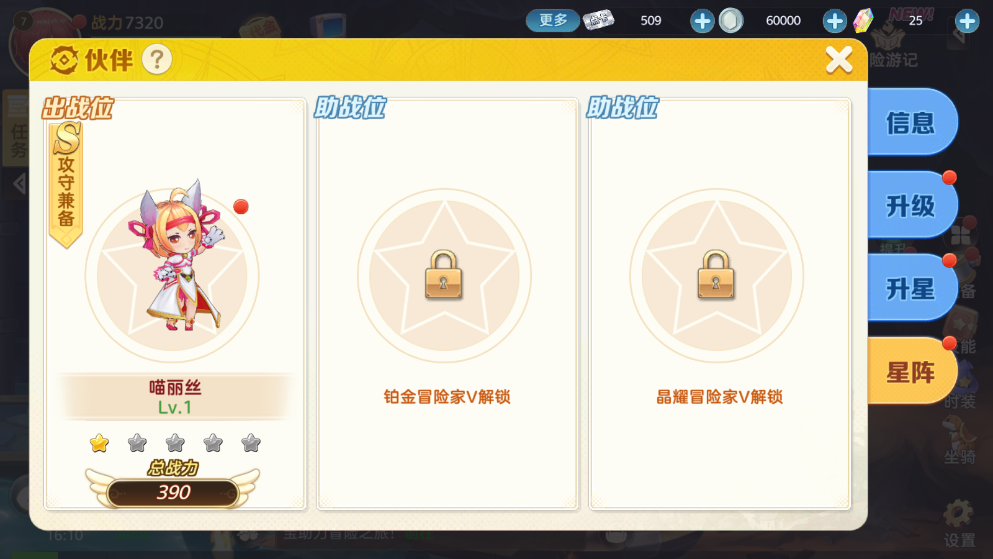 在【伙伴】界面,我们可以看到伙伴的基本信息,以及升级、升星、星阵界面。