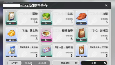 材料采购这事看着不起眼,实际上直接关系到店铺能不能正常运转。左下角有个供应链的按钮,点开之后,可以选择24小时配送服务。虽然这服务会多收5%的配送费,但是省去了手动采购的麻烦。咖啡豆和可可粉这两样东西,建议保持够用3天的库存量,因为用得比较频繁。薄荷和面粉就不一样了,这俩保质期比较短,控制在1天的用量就够了。