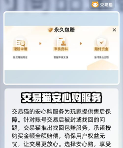 安全性是账号交易环节不可忽视的关键要素。交易猫推出“安心购”保障体系,对符合条件的账号承诺永久包赔——若发生账号找回、异常封禁、角色数据异常丢失等风险事件,平台将启动赔付流程并协助处理。该机制覆盖从支付到交付的全流程,显著降低交易不确定性,让用户专注享受游戏本身,而非担忧资产安全。