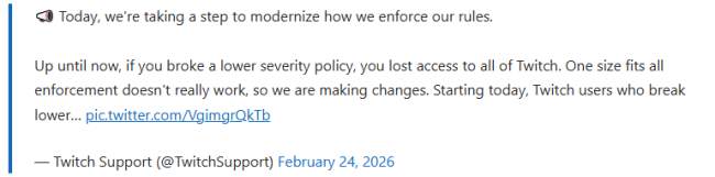 ·Twitch官方表示新的违规惩罚规则正在陆续制定,今后将根据违规项目种类以及轻重程度引入不同的惩罚措施,先行预定封禁发布以及封禁发言两种,之后陆续追加其他封禁种类。