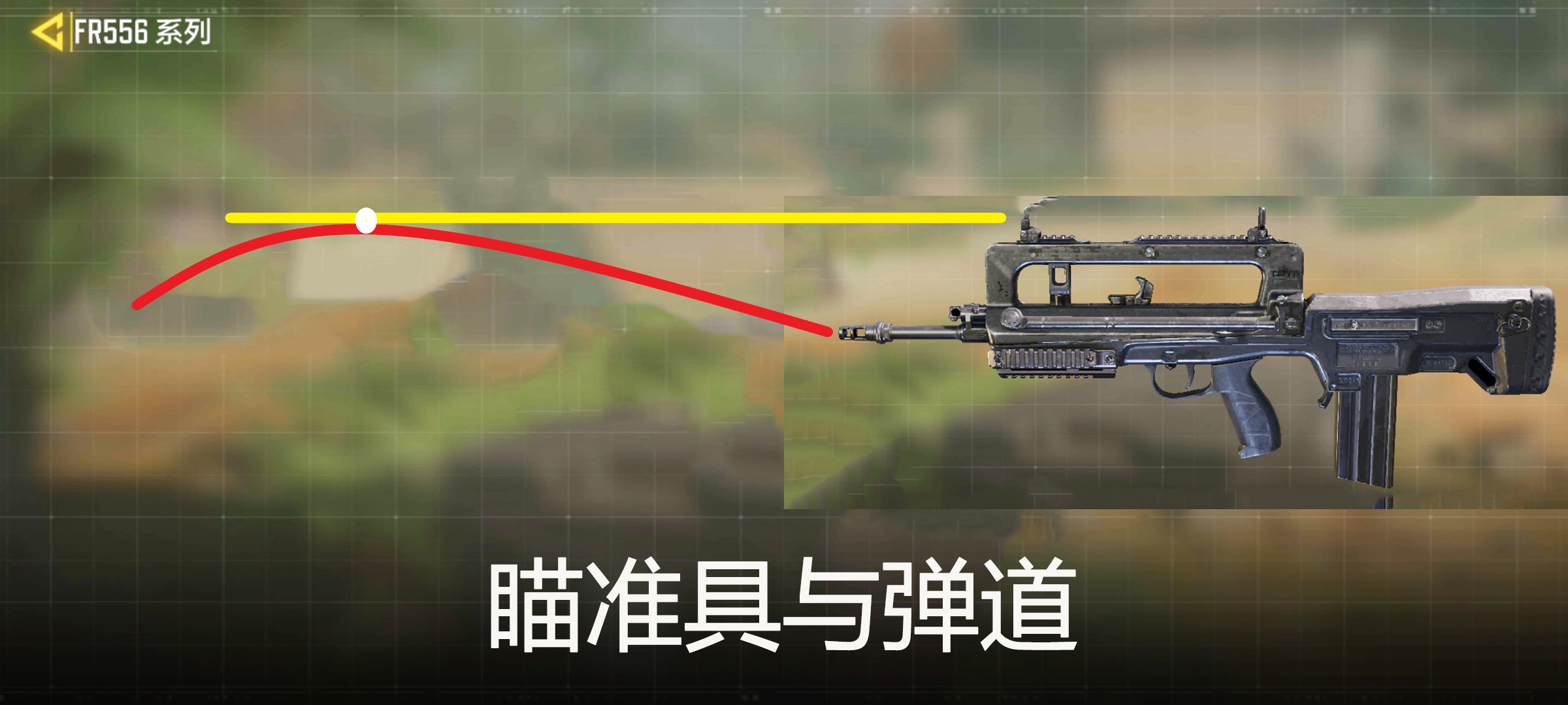 其实子弹会受到重力等多种因素的干扰,为了提高命中率,刚出枪口的子弹会略微朝上移动,整体弹道呈抛物线进行延展,这条线与瞄准具的交叉点(白点)才能准确击中目标(具体可参考上图),现实中常常要进行多次校准来保证命中率。使命召唤手游中的FR556在瞄准射击时就会给人一种枪管较低的感觉,建议大家多多练习适应,或是安装红点瞄准镜来改变射击视野。