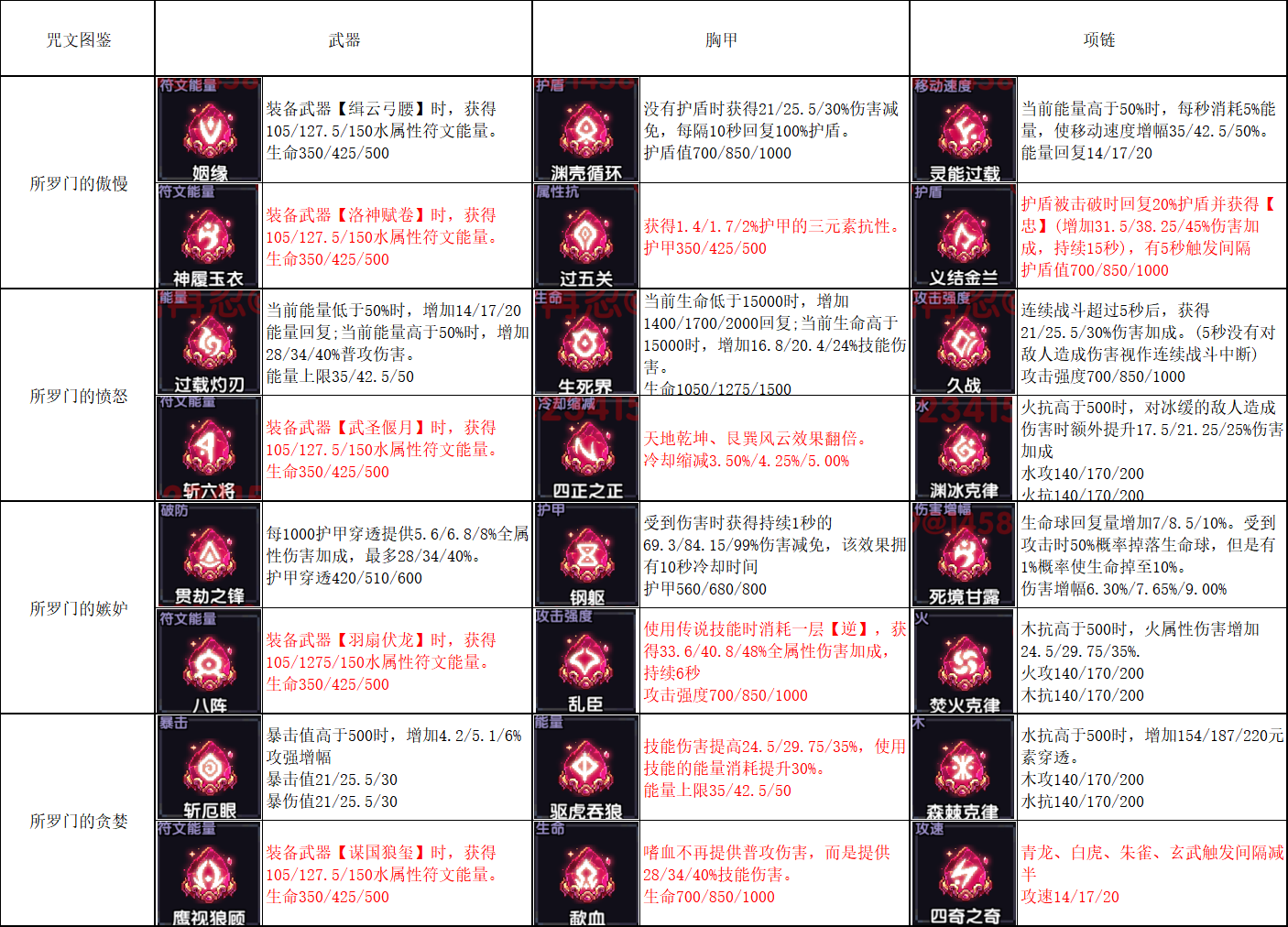 如下图,其中新增加的咒文已标红,其余咒文均为老咒文加了一些数值。