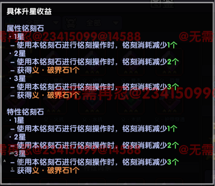 总共有11个属性铭刻石和62个特性铭刻石,共计通过铭刻石图鉴升星可以获取11*2+62=84个破界石,脸不是太黑够升满一个部位的咒文,欧皇能升满接近俩个。