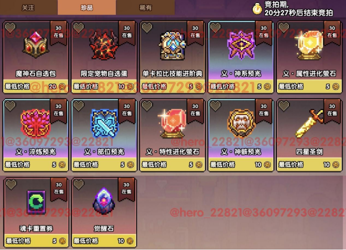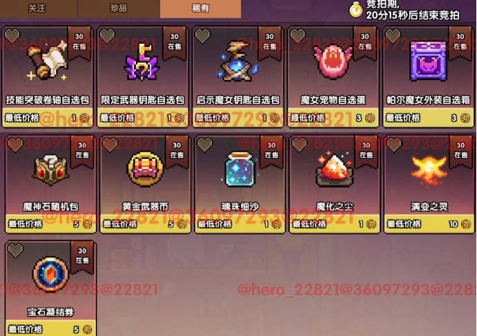 每种待拍道具数量30(可能会变),玩家在拍卖的半小时内可以自行加价,最终价高者得~