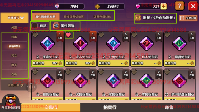 点进市场摊位,会有关注-装备-装备材料-咒文-魂卡-石板五大类,部分类别下又有细分,如装备材料又分为属性词条铭刻石、特性词条铭刻石和装备升级材料,点击对应子类后,右侧会定时刷新该类商品列表,展示商品的在售数量和当前最低价,方便玩家快速了解该类商品当前市场情况;如果明确知道自己要买哪个商品,可以点击左上属性筛选的小放大镜,选择需要购买商品的属性;