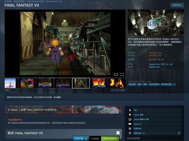 《最终幻想7》PC新版本上线,现已登陆Steam和GOG平台,售价12美元(Steam国区40元),而原版《最终幻想7》已经停售。已拥有《最终幻想7- 2013版》的玩家,无需额外付费即可获得新版本。