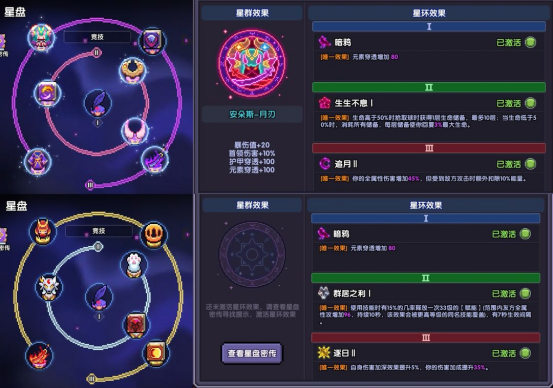 •星盘概述:星盘共有3圈,每一圈装上相同的星棋激活后可以获得属性,如果达成星棋组合,则会额外触发效果。