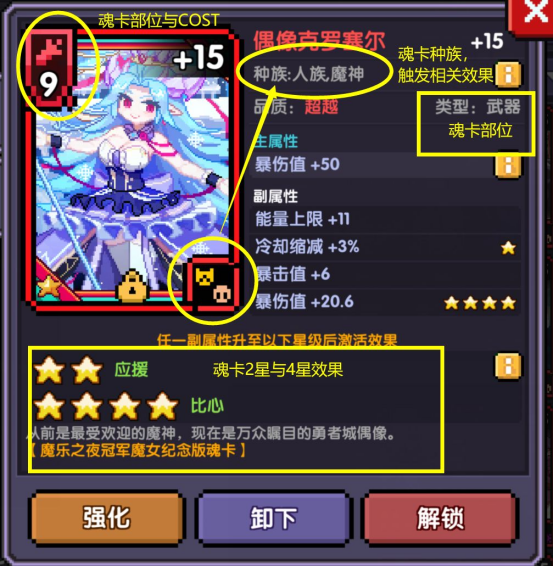 •底下黄框则是魂卡的效果,2星时激活一个效果,4星时激活另外一个效果。