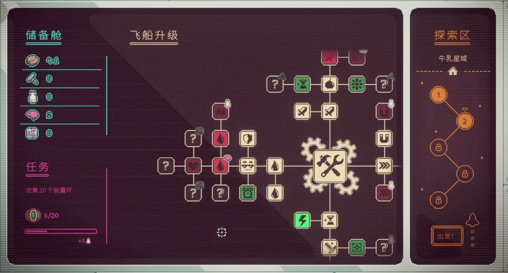 除基础采集外,飞船成长体系是本作另一大亮点。初始状态下,飞船的移动速度与激光攻击力均处于基础水平;随着关卡推进,玩家需持续消耗所获咖啡豆,对飞船模块进行定向强化。升级路径覆盖机动性、火力输出、能量续航等多个维度,支持自由搭配发展路线,满足不同策略偏好。
