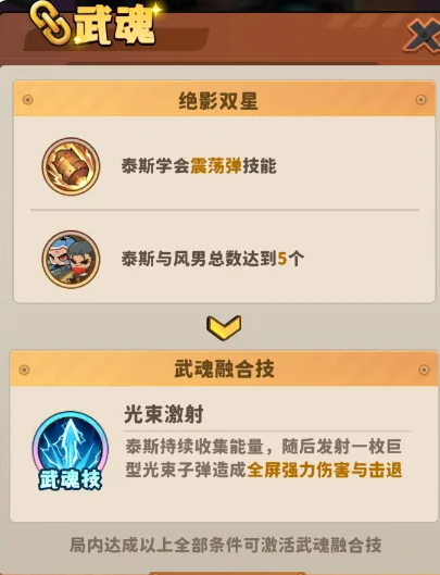 第一组为风男与泰斯的组合技「光束激射」。触发前提有三项硬性要求:其一,两人必须同时编入出征小队;其二,泰斯需习得并主动装备技能「震荡弹」,否则无法启动连动链;其三,小队中风男与泰斯的总数量须达到或超过5名。三项缺一不可,任意一项未达标,即便进入关键战斗节点也无法释放。