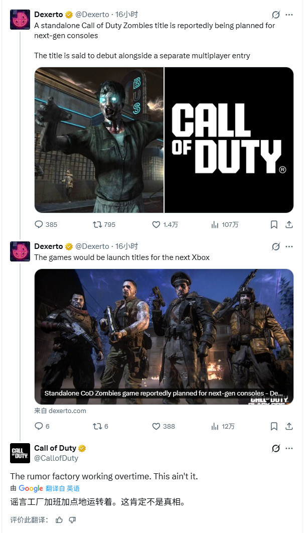 外媒Dexerto转发了TheGhostofHope的爆料,而《使命召唤》官推在下方回应称“造谣工厂正在加班加点地生产”,并强调“这绝对不是真相”。