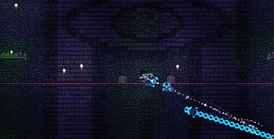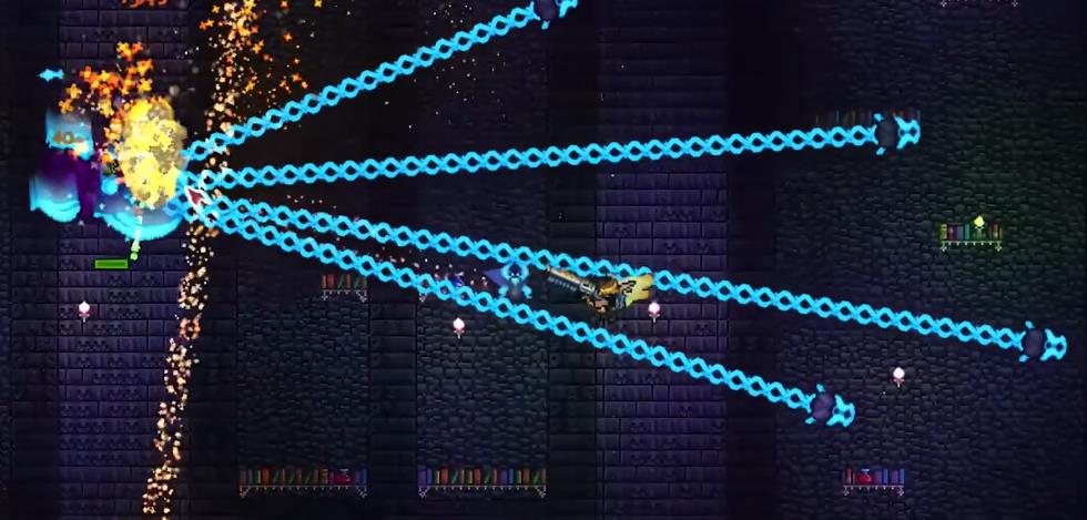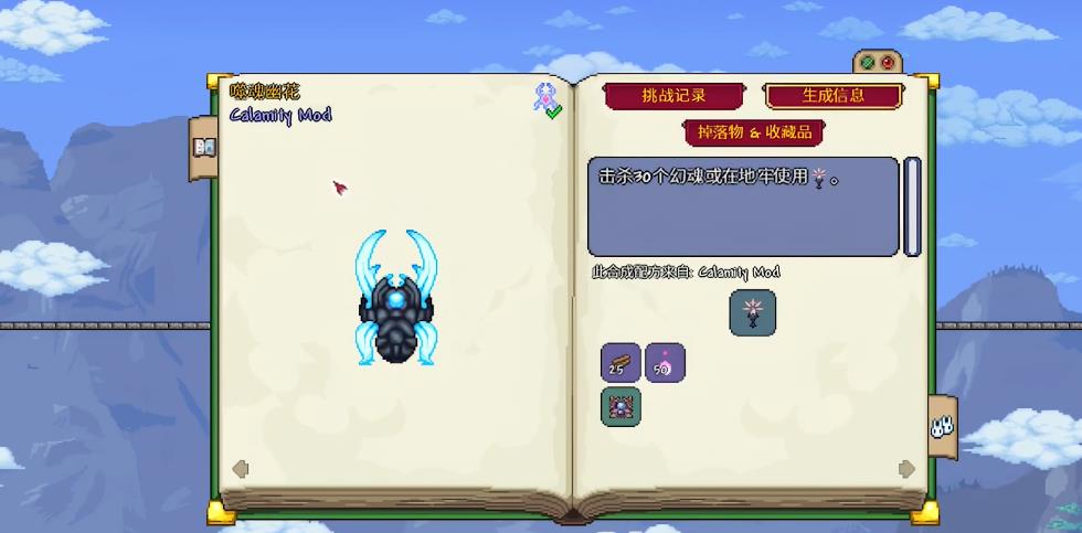 噬魂幽花与世纪之花类似,有20%左右的减伤,如果被触碰到会获得月噬的效果,让玩家无法从其身上吸血,需尽量避免近距离接触。在一阶段会通过触爪移动,拥有两种散射弹幕,一种就是速度较慢的箭型弹。发射一段时间后会折返攻击玩家,威胁较高但无法穿墙。一种弹幕的速度较快,且可穿透墙体,命中后会造成夜魇减益效果。它的身体会变为红色,随后移动至玩家对角位置,对玩家发起一次冲刺,半血后进入第二阶段。
