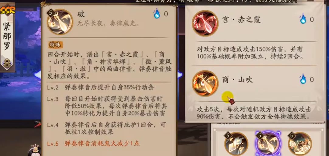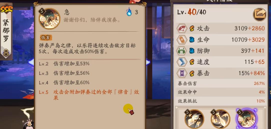 如果使用乐器副本的特殊机制,鬼火充足,可把追月神换下,多带一个输出,只是打本速度有差异,最多打两次也能过。在斗技时紧那罗推荐带针女、招财或轮入道,御魂属性选速攻爆伤即可。紧那罗的强度比刚出现的缚姬更要强,有资源能抽到的最好,抽不到的话则使用绘卷换碎片即可。她的二技能孤立效果可跳过小白,直接攻击缚姬,给其挂孤立后所有式神集火就能无视小白的保护。
