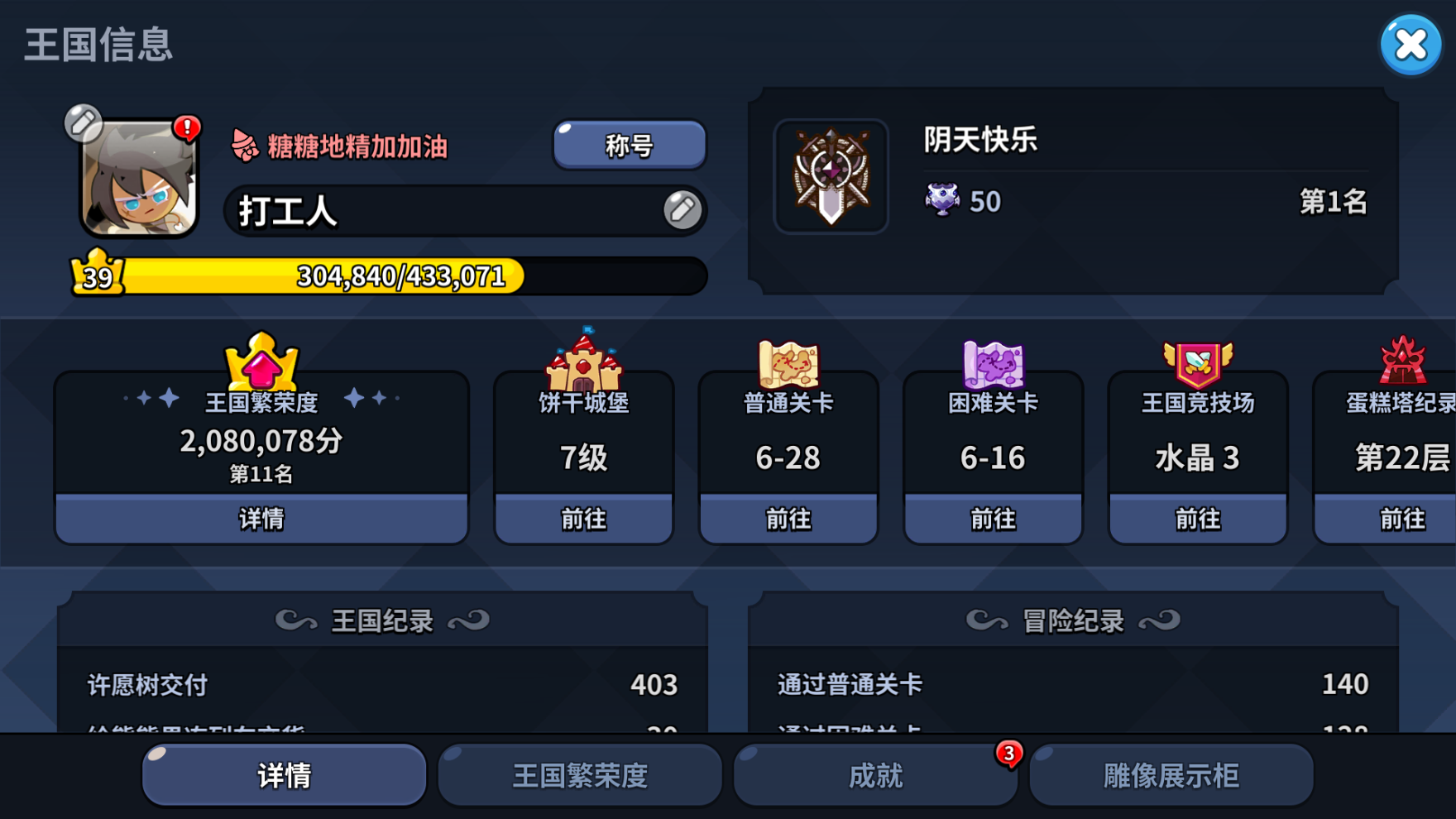 人物等级能达到39级左右,体力基本上也都是在刷困难关卡,0氪的城堡能7升8,但是因为7升8要一天时间,所以除非是0点就开升,不然当天升不完。7升8最麻烦的地方在于需要70万的金币,所以不够的当天要刷许愿树凑金币。