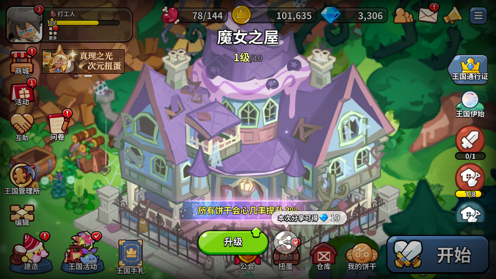 右侧的领地先开辟两个有东西的地方。当天可以解锁一个叫做魔女之屋的建筑,同时解锁“魔女与幽灵之野”这个系列的装饰。建造党是比较开心的。