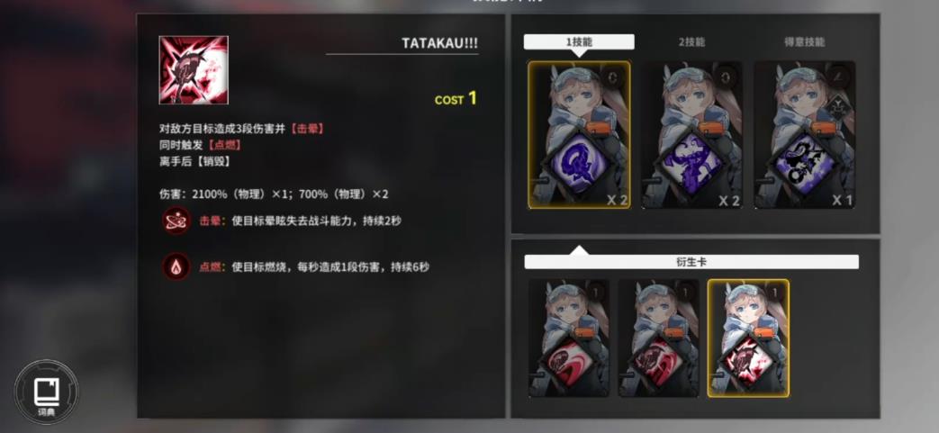 星花的一振效果是在使用技能后为自己回血,由于其站位基本在所有角色之前,算是给血量并不算高的她增加了生存力。一技能为零费紫卡,效果是使用后产生三张一费红卡,带有点燃和击晕的负面效果,一般情况下不使用。只有类似于在索马队等,打出红卡会减队长技冷却的队伍里才会使用该技能。二技能是零费紫卡,使用后生成两张两费黄卡,打出后抽一张牌,优先紫卡,并给前排提供练功效果。