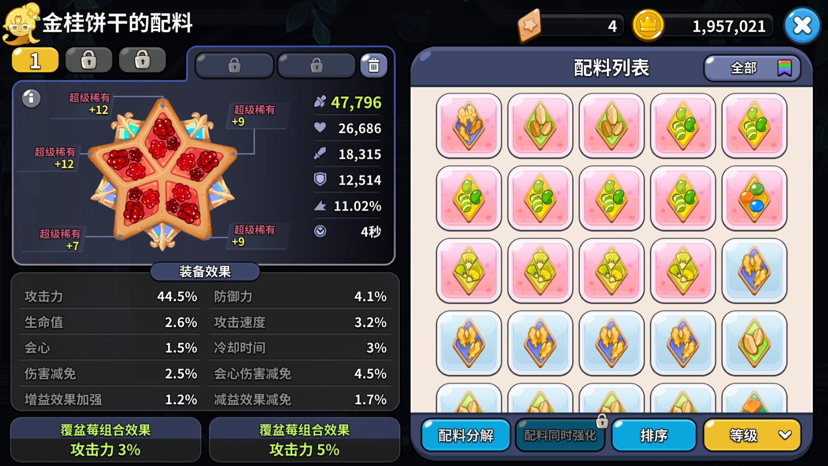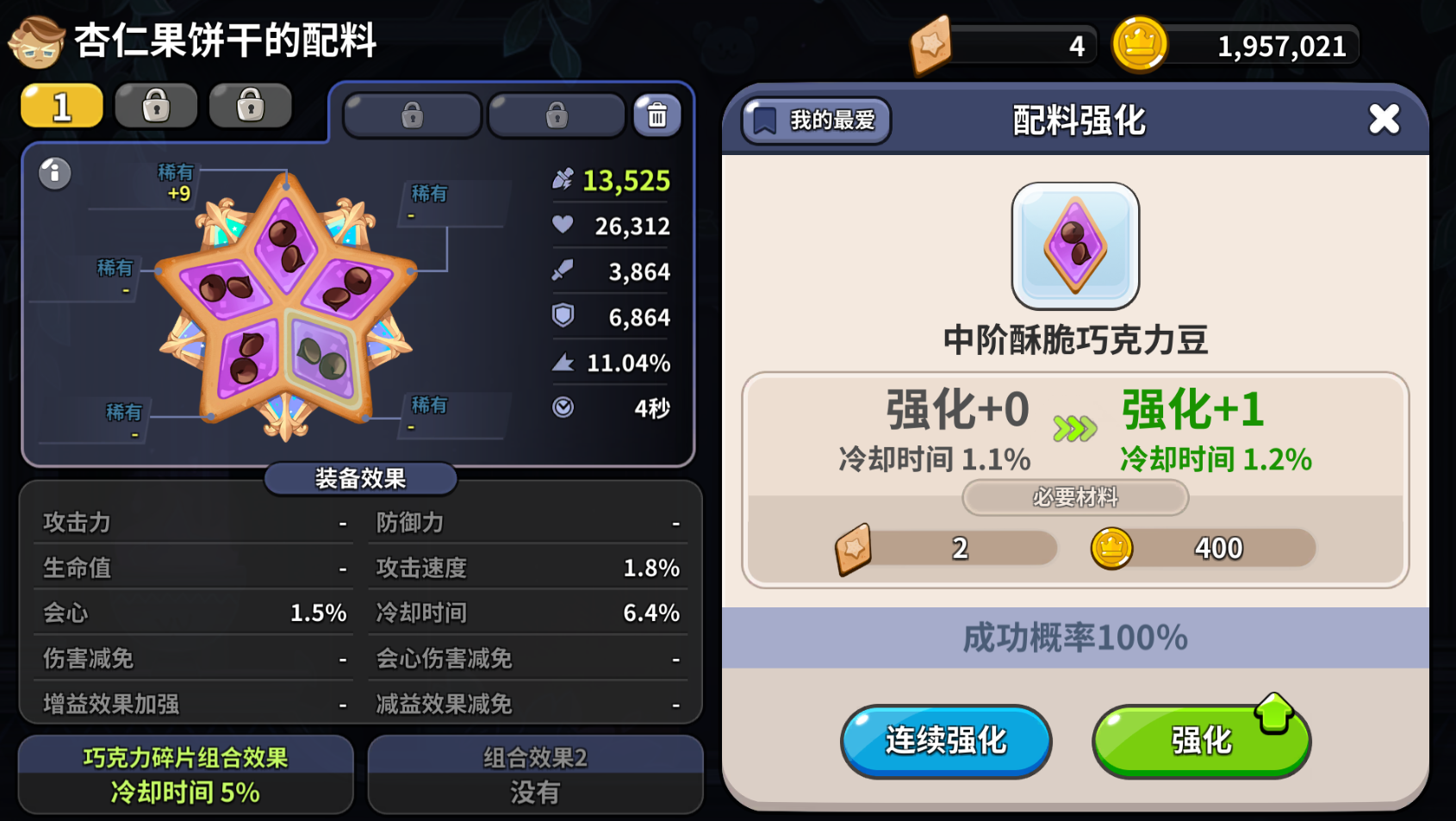 配料的强化是除了建造和科研方面,第三个消耗金币比较多的环节。尤其是是升级高阶配料的时候,失败一次就出去1万金币。但受限于另一个消耗材料配料碎片的限制,以及非主力饼干不优先培养的考量,再加上最好的配料最多就强化+12,因此配料培养方面的金币使用量虽然大,但不是无底洞。