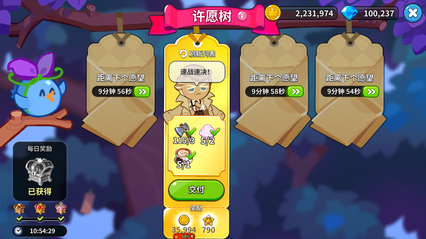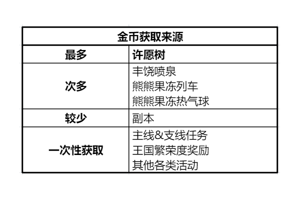 目前游戏中获取金币最多的地方是许愿树,基本上多提交几轮许愿树就有大几十万的金币了。但是由于部分产品的生产时间比较长,许愿树提交不了可以刷新列表,但熊熊果冻列车必须要等提交之后才能发车。因此在许愿树碰到需要提交生产时间长但数量少的产品时,建议直接刷新。提交金黄色愿望的,获得的金币会更多。