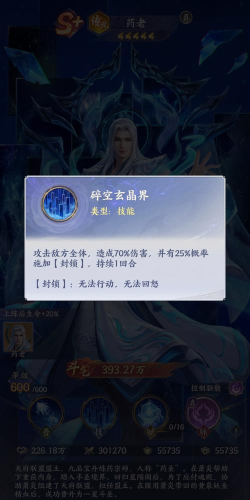 核心大招“碎空玄晶戒”是药老战术价值的核心体现。该技能可对敌方全体目标造成显著范围伤害,并附带概率性“封锁”效果——被封锁单位将无法执行任何行动(含普攻、技能释放及怒气回复),直接打断敌方关键循环。这一机制使其成为对抗高爆发输出或强力治疗阵容时的首选反制手段。