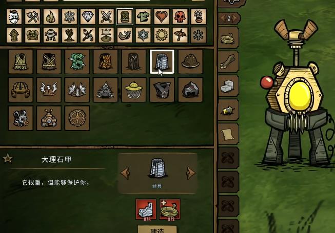 橄榄球头盔是泛用性最高的护甲装备,只需要一根绳子与一个猪皮就能提供八十点的防御力。虽然猪皮看起来比较昂贵,但是通过敲掉猪屋或者猎杀猪人就能获得不少。又因为锤子不需要科技就能直接制作,从对局刚开始的时候就能获取大量的猪皮。在解锁铥矿和绝望石护具前,该头盔的防御力就已经完全足够了。作为头戴式的装备,比占用身体栏位的护甲更为方便,即便解锁了铥矿护具,通过两者混搭就能节省不少的铥矿。