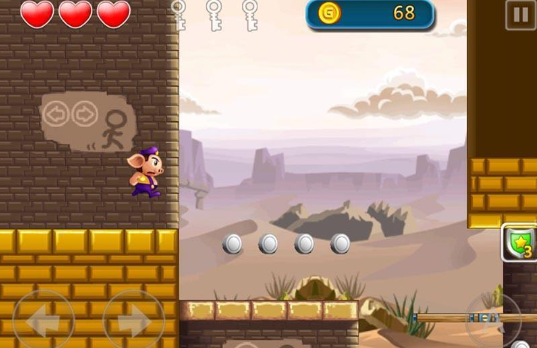 这是一款像素风横版动作冒险游戏,主角为拟人化小猪形象,造型灵感源自传统神话角色,憨厚中带俏皮。玩家操控角色跳跃、奔跑、收集金币与道具,在多变地形中完成闯关目标。关卡含隐藏要素与分支路线,辅以简易物理交互机制,整体节奏明快,兼具怀旧感与现代操作优化。