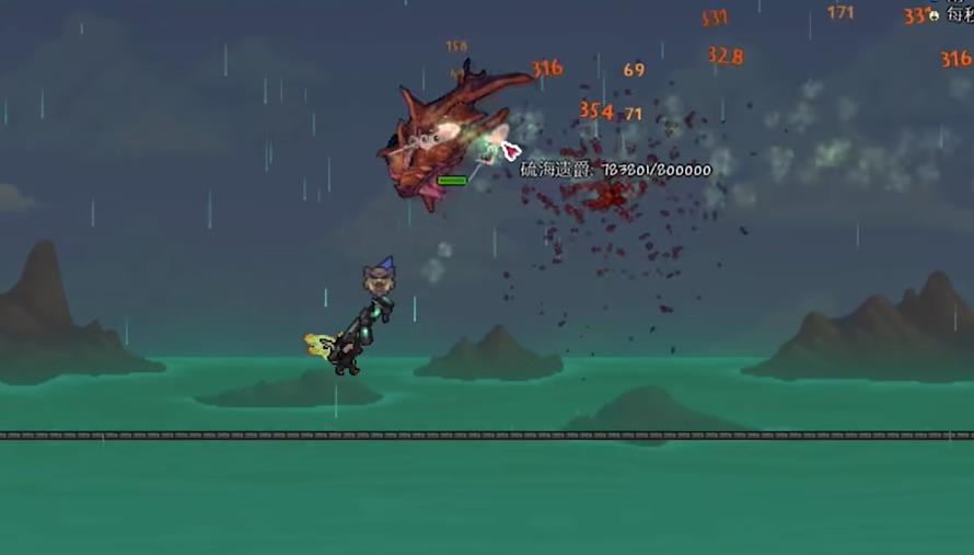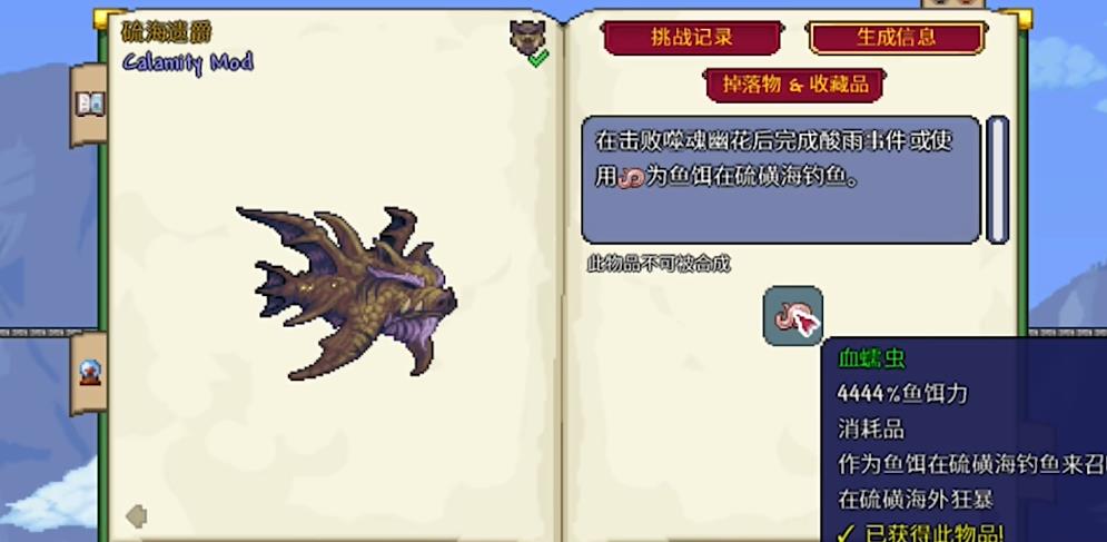 硫海遗爵是月后才会出现的boss,可以用血蠕虫当做鱼饵从水域里面钓出来。如果要是不想去钓鱼的话,就可以等待酸雨事件,在其来临后的第三阶段,等满进度时便会出现龙卷风,接着该boss就会直接出现。该生物的行动与猪鲨类似,从海里出来以后便会进入到暴走状态,不过冲刺会预判玩家的移动,攻击严格遵循固定循环释放。在初始阶段进行三次冲刺,等冲刺结束后释放五个鲨牙刺球,刺球具备追踪特性。
