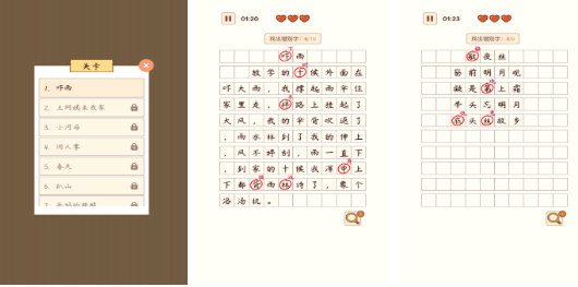 专攻汉字结构解析能力训练。玩法分为两阶段:先拆解目标字为最小构形单元,再重新组合为新字。内置易错字库与高频生僻字模块,含障碍模式(限制操作步数)与限时挑战(倒计时通关),有效缓解“提笔忘字”现象。