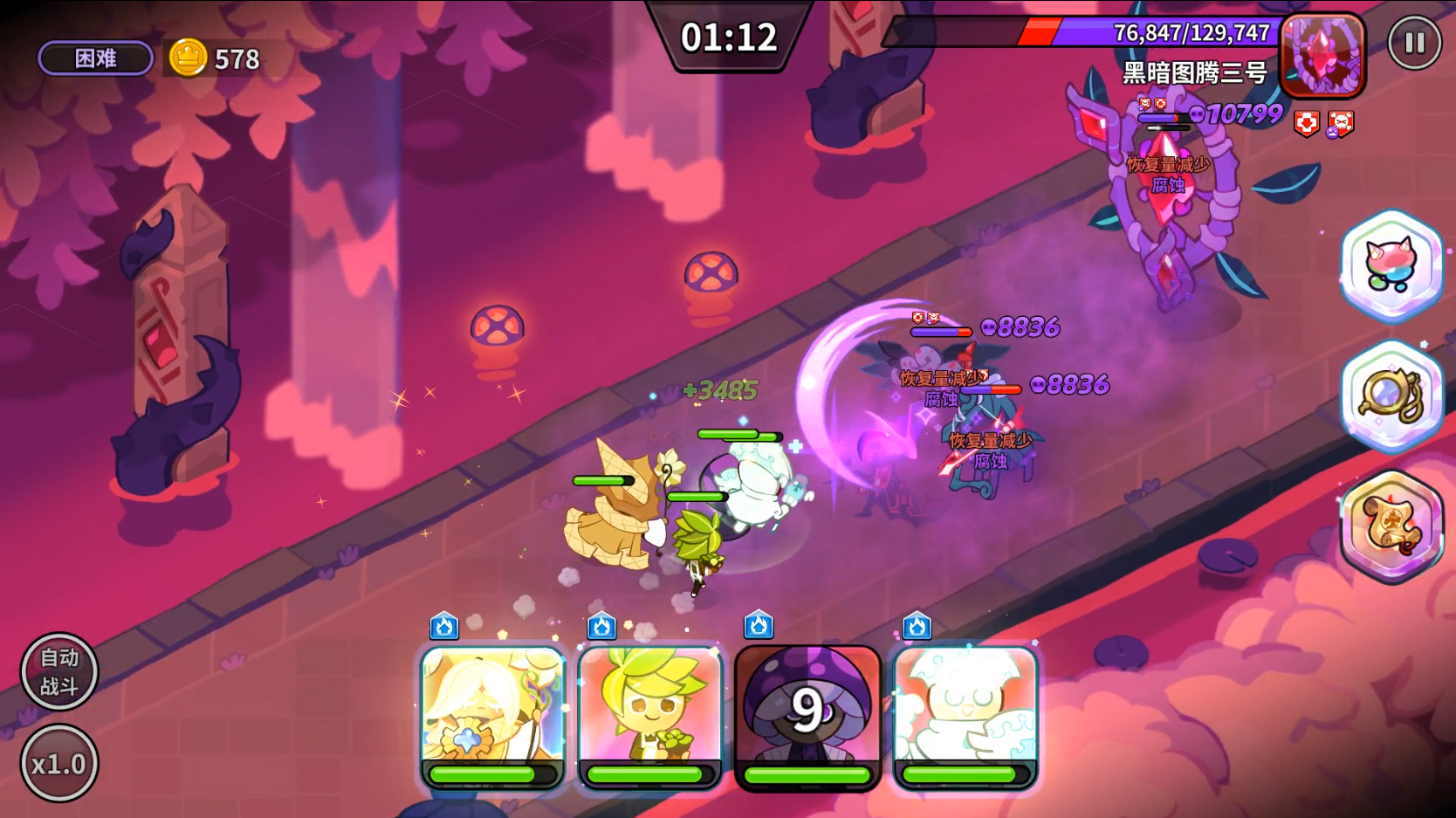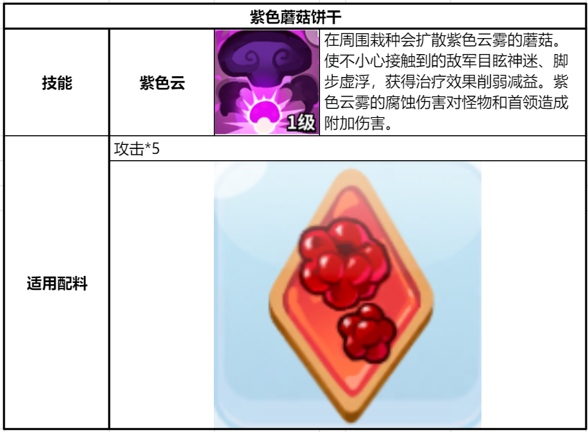 紫蘑菇饼干是一个技能可以造成大范围的持续伤害,同时能产生减疗效果的饼干,伤害高,范围广,不管是PVP还是PVE都非常适用。而且,因为能提供群体减疗,所以是非常适合PVP竞技场的。
