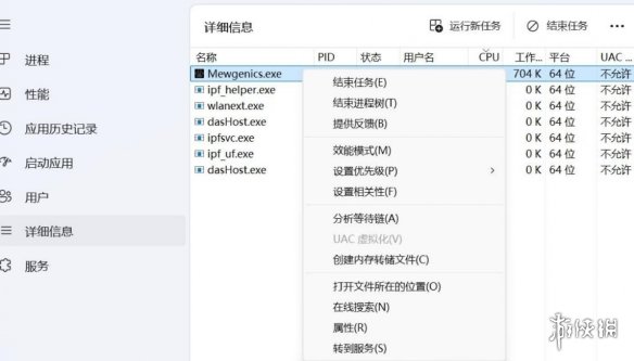 在任务管理器中,切换到详细信息选项卡,找到游戏的进程,名称为mewgenics.exe。