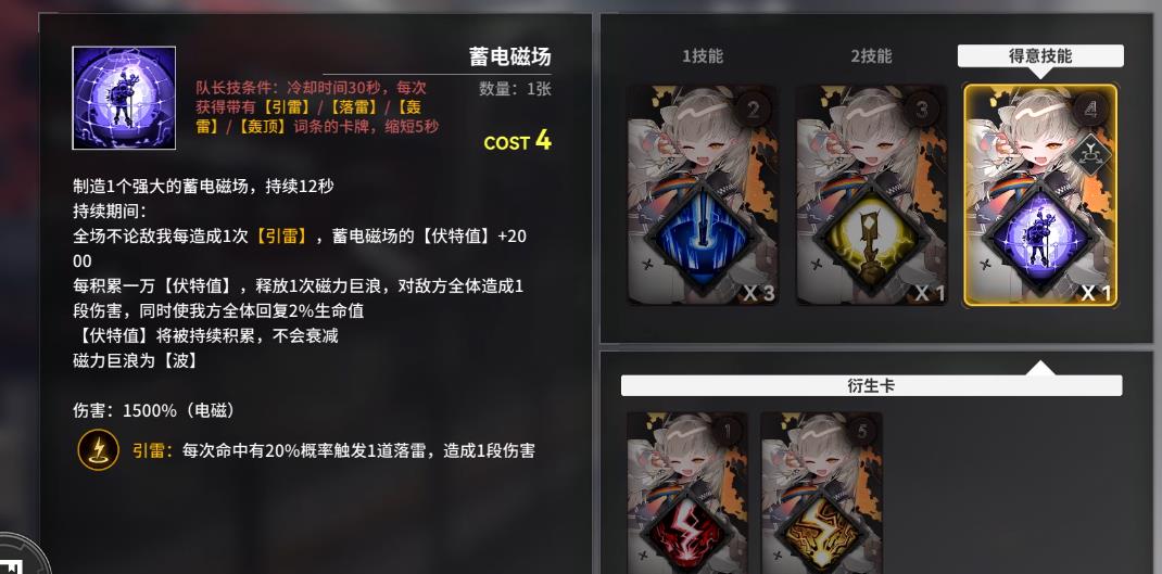 蓄电磁场有两张衍生卡,分别是十万伏特和百万伏特,每累计10万的伏特值会生成一张十万伏特加入手牌,每累计100万的伏特值会生成一张百万伏特加入牌库的顶端。这两张卡牌都能造成群体伤害伤害,受全队攻击力的影响,倍率为1200%和12000%,在妮蔻拉的队伍中可加强对群能力。