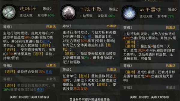 【连环计】可随机攻击三名敌方单位,并在智力比拼获胜后,为敌方目标施加独特的【连环】状态(使该单位受到伤害的16%传递给其他拥有【连环】的单位)及珍贵的15%【易伤】效果。