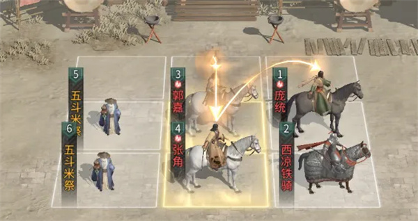 兵种站位:在庞统的下方放置一个西凉铁骑,在郭嘉和张角身后各放置一个五斗米祭。