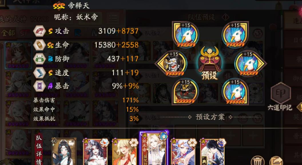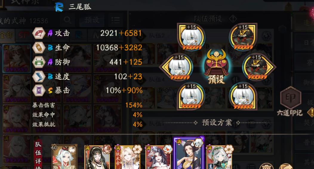 剩下一个位置可选择八百,需要满三技能,选择攻攻攻或者暴满暴的散件。携带三预知镇墓兽或者茨球契灵,在实战过程中需要让帝释天锁定二技能,SP红叶锁定普攻,八百锁定预知,而其余式神都自动妖术挂机就可以了。如果要是SP面灵气二技能不满四级的话,那么就将御魂更换为满暴击即可,依旧选择海月。