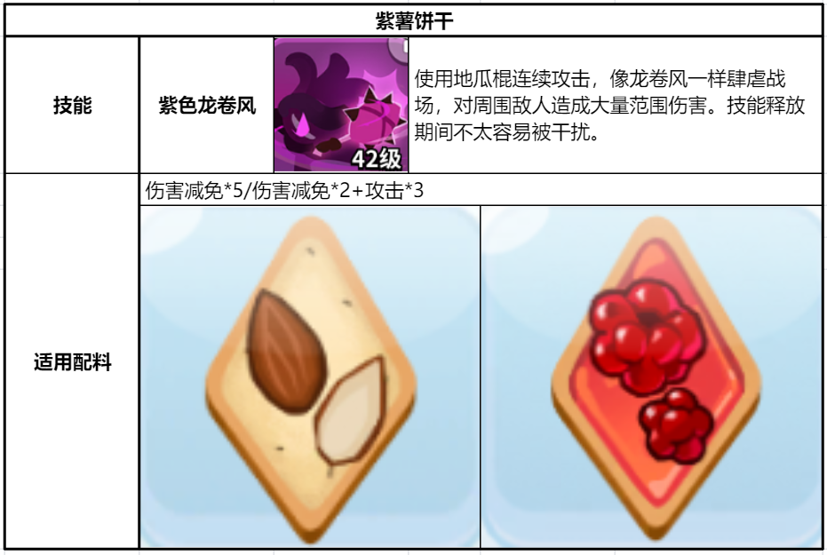 技能是抡起棒槌猛转对手,差不多能转8圈,同时攻击的对手越多伤害越高。因为转敌人的时候紫薯饼干不容易被打断,而且可以转到对手后排,所以作为一个可以扰乱对手技能释放的饼干,紫薯饼干既可以打PVE,也能打PVP。