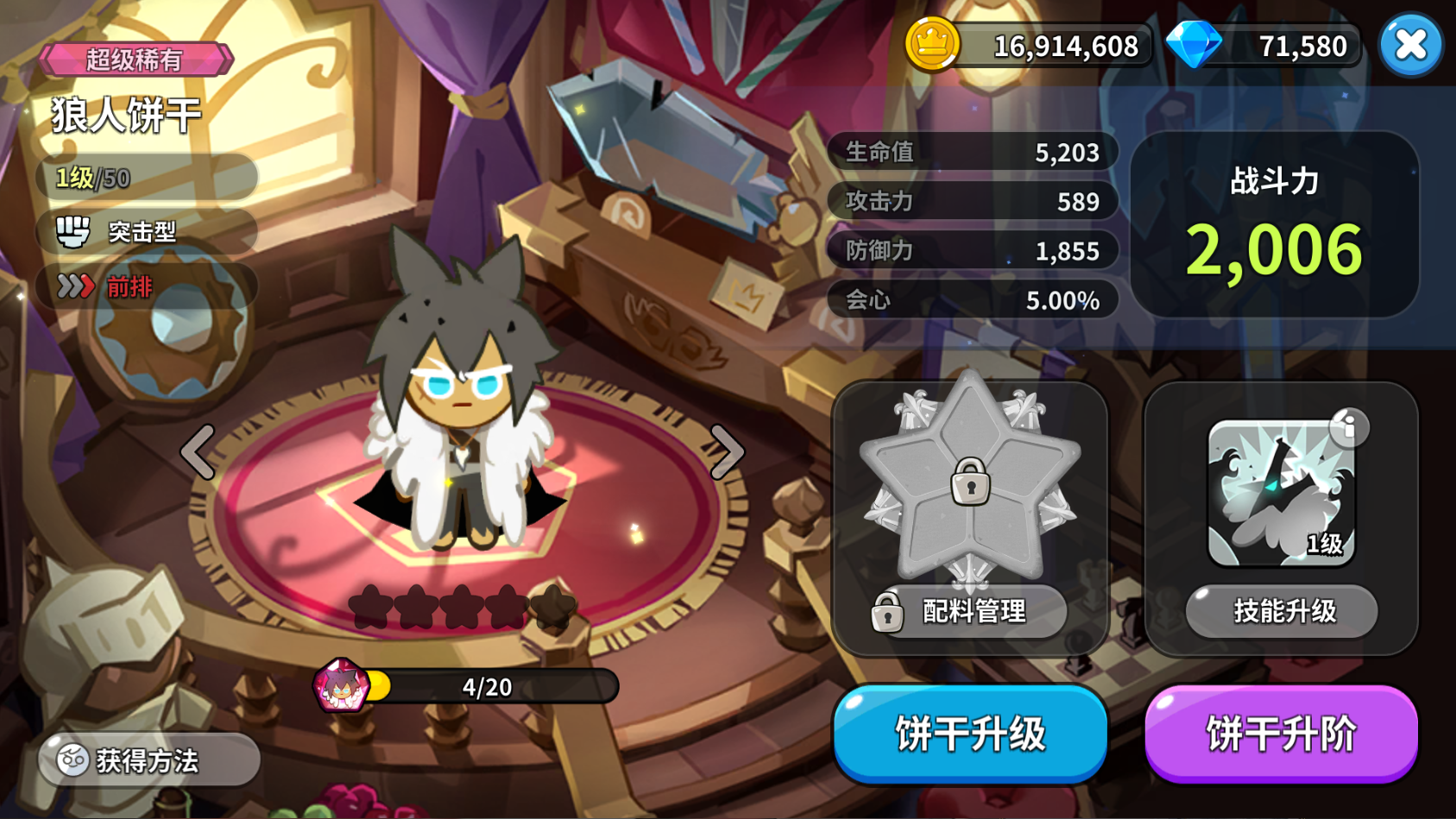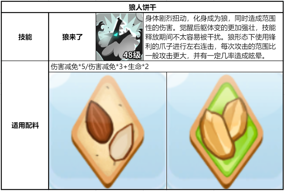 狼人饼干是突击型饼干中,最能打能抗的一个,尤其是变身之后体力这涨20%,这也是为什么狼人饼干可以带生命配料的重要原因。变身后,狼人饼干至少可以猛抓目标四下。PVP和PVE都很好用。