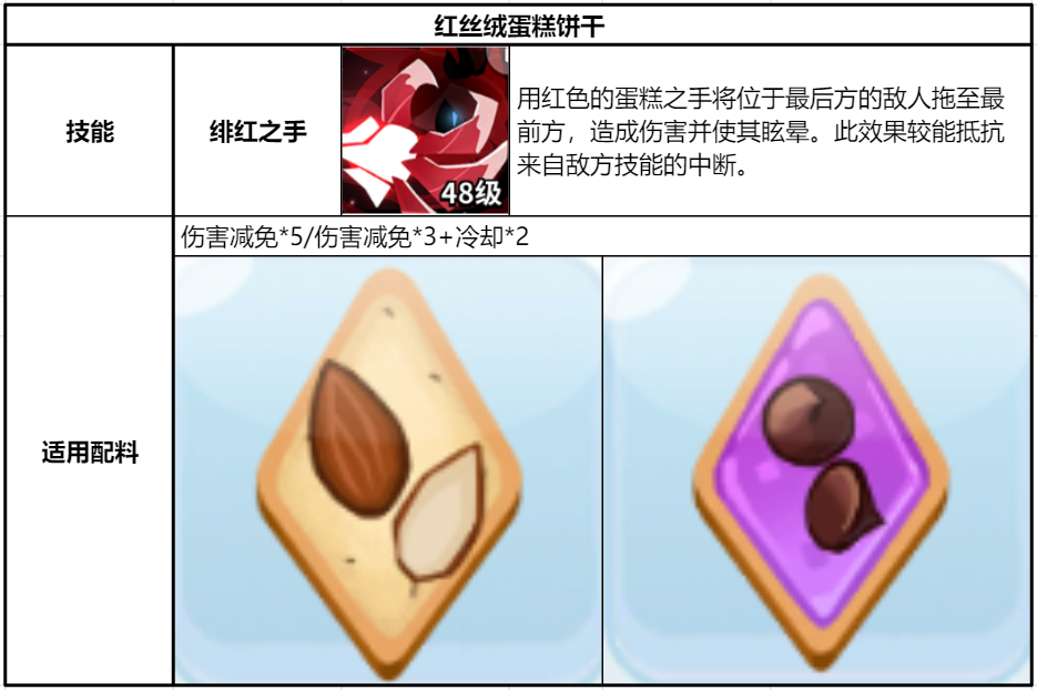 红丝绒蛋糕饼干是一个技能带控同时对后排单体伤害非常高的饼干,能把对方后排的恢复型饼干抓到前面,伤害高的情况下能直接秒掉对面治疗,在竞技场非常好用。