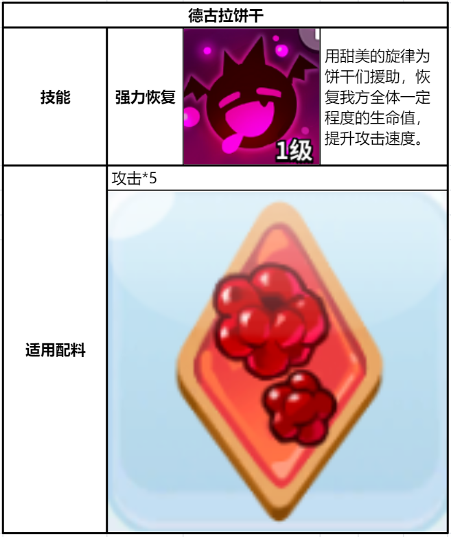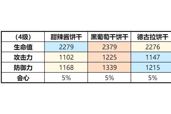 三种奇袭型饼干同为4级时的各项数值如下,其中甜辣酱饼干和德古拉饼干的攻击位置是后排,黑葡萄干饼干的攻击位置是中排。